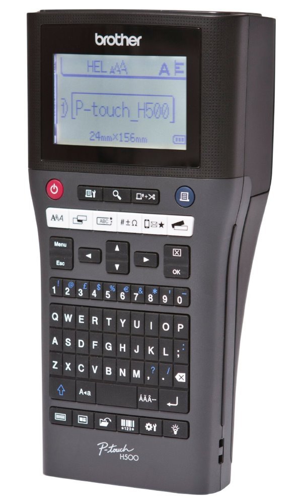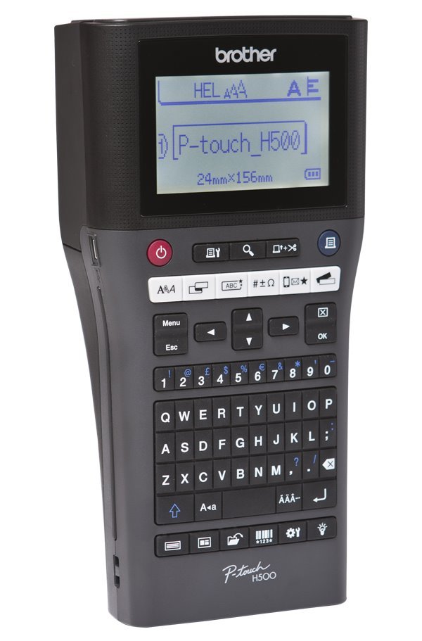 Tiskárna štítků s možností připojení a tisku z PC, pro pásky 3,5-24 mm. Ruční popisovač PT-H500 je vhodný do skladů i terénu. Štítky lze vytvářet pomocí klávesnice nebo je možné tiskárnu připojit k PC a pomocí P-Touch editoru tisknout. Součástí dodávky je páska 24 mm (černé písmo na bílém podkladu) USB kabel a řemínek na ruku. Zařízení je napájeno pomocí 6 x AA baterií. Jako volitelné příslušenství je možné dokoupit Li-ion akumulátor BA-E001 a AC adaptér AD-E001.