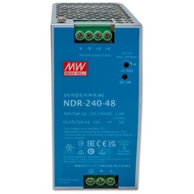 Napájecí zdroj pro instalaci na DIN lištu. Výstupní napětí 48 V DC, zatížitelnost 240 W. Provozní teplota -10 až 70 °C.