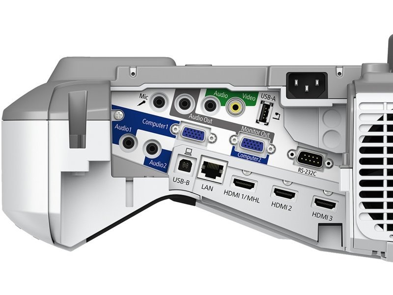 Rozhraní: 1 x USB typ A, 1 x USB typ B, 1 x sériový RS-232C, 1 x RJ-45, 1 x VGA vstup, 1 x VGA vstup/výstup, 3 x HDMI, 1 x kompozitní vstup, 3 x 3,5 mm jack vstup, 1 x 3,5 mm jack vstup pro mikrofon, 1 x 3,5 mm jack výstup