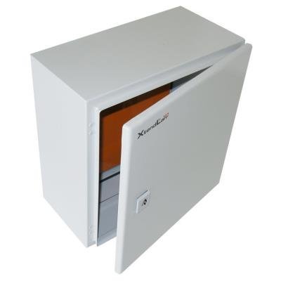 Univerzální rozvaděč 380x210x380mm (š x h x v), IP66, ocelový, šedý. Třívrstvá povrchová úprava (fosfátování, máčení v základním laku, práškový lak), zaměnitelné dveře, pevná konstrukce. Odnímatelný kryt kabelového průchodu.