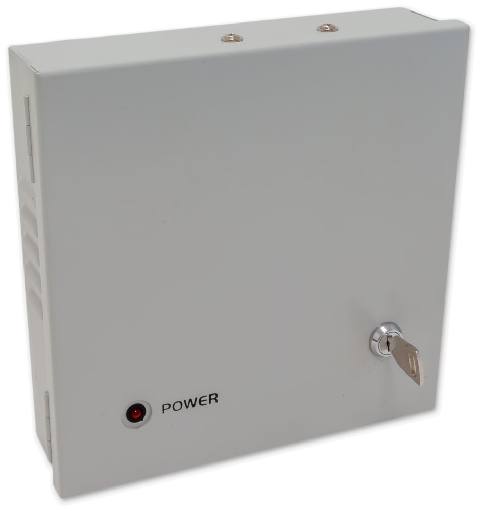 Stabilizovaný napájecí zdroj pro čtyři spotřebiče, nastavitelné napětí DC 12-14 V, každý port max. 1 A. Celkový výstupní proud 3 A, krátkodobě 3,5 A. Skříňka na zeď s instalovaným PCB s hlavním vypínačem a kabelovými průchodkami. Připojení kabelů k interní svorkovnici. Ochrana proti zkratu přístrojovou pojistkou, ochrana proti přepětí. LED signalizace funkčnosti portů. Dvířka jsou vybavena jednoduchým zámkem.