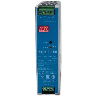 Napájecí zdroj pro instalaci na DIN lištu. Výstupní napětí nastavitelné DC 48-56 V, zatížitelnost 75 W. Provozní teplota -10 až 60°C.
