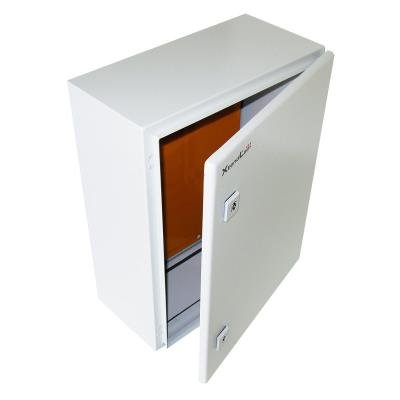 Univerzální rozvaděč 400x210x500mm (š x h x v), IP66, ocelový, šedý. Třívrstvá povrchová úprava (fosfátování, máčení v základním laku, práškový lak), zaměnitelné dveře, pevná konstrukce. Odnímatelný kryt kabelového průchodu.