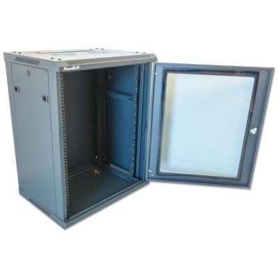 Rozvaděč, 19", na stěnu, jednodílný, rozložený, výška 15U, 600 x 450, skleněné dveře, kouřové sklo, nosnost 60kg, černý