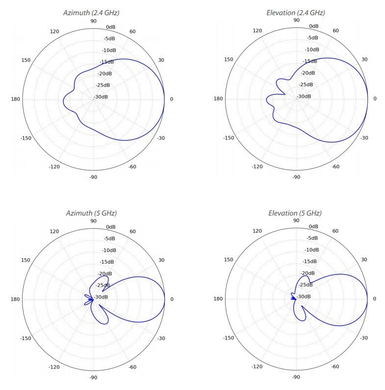 Vyzařovací úhel antény v pásmu 2,4 GHz je 90° (10 dBi) a v pásmu 5 GHz 45° (15 dBi).