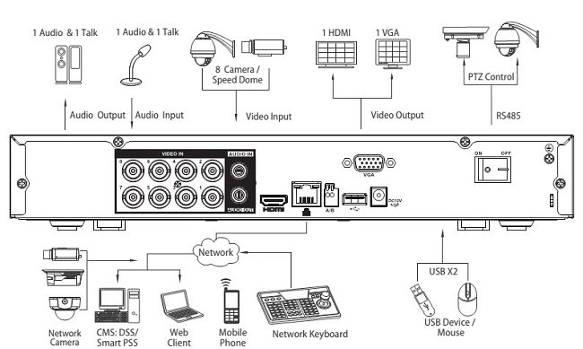 Uživatel ze vzdáleného místa může k rekordéru přistupovat z LAN/WAN přes TCP/IP protokol web prohlížečem nebo lze použít mobilní aplikace pro přístup z mobilních prostředků jako jsou telefony a tablety. Zařízení podporuje připojení technologií P2P, tzn. pomocí sériového čísla zařízení (nikoliv IP adresy), není tak potřeba veřejná IP adresa při požadavku na přístup z Internetu.