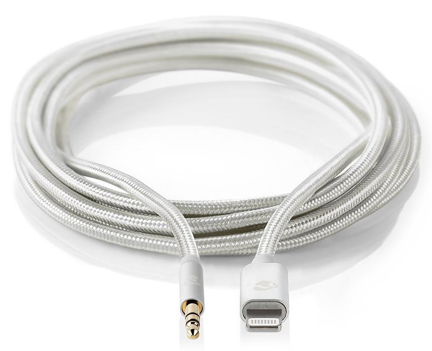Kabel, audio, Lightning zástrčka - 3,5mm jack zástrčka, nylon, stříbrný, 1m