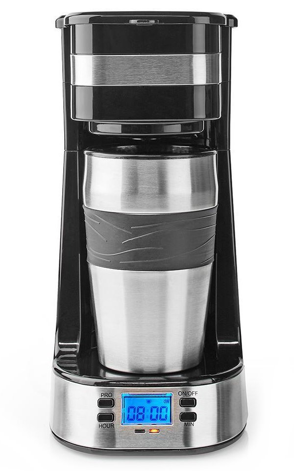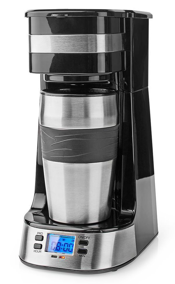 Kávovar, 700W, na jeden hrnek, kapacita 0,42l, časovač, černo-stříbrný + dvoustěnný cestovní hrnek