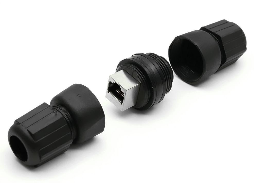Stíněná RJ-45 spojka M22 pro Ethernetový kabel kategorie 5e ve vodotěsném krytí IP67, která umožňuje vodotěsný spoj kabelů instalovaných v exteriéru.