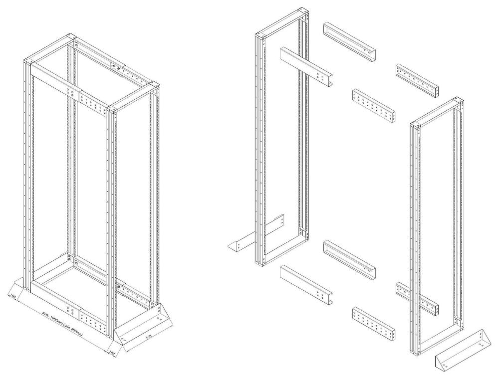 Rozvaděč, stojanový, otevřený, 19", výška 42U, 600x1000, vysokonosný, nosnost 1200kg, černý