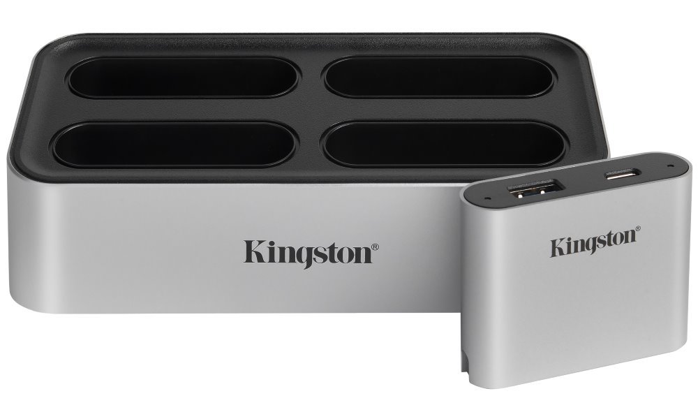 Dokovací stanice pro čtečky paměťových karet Kingston Workflow poskytuje flexibilní systém pro přenos videí, fotografií a audia. Stanice umožňuje připojit až čtyři čtečky současně a urychlit tak celý postprodukční proces. Pro připojení využívá rozhraní USB 3.2 Gen2 typ C. Samotné moduly, včetně přiloženého USB miniHubu, využívají pro připojení ke stanici rozhraní USB 3.2 Gen1 typ C.