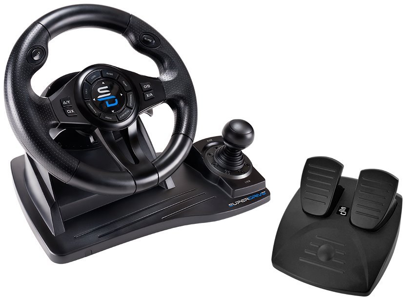 Set SUPERDRIVE GS550 obsahuje vše pro komplexní řízení virtuálního vozu. Tato sada obsahuje volant, pedály a řadicí páku, abyste dosáhli maximálně autentického zážitku ze řízení vozu. Volant disponuje 270° úhly otáčení, díky čemuž se přizpůsobí každému jízdnímu stylu. Nezáleží na tom, jestli jedete střídmě a na jistotu, nebo se snažíte prchnout před policií.