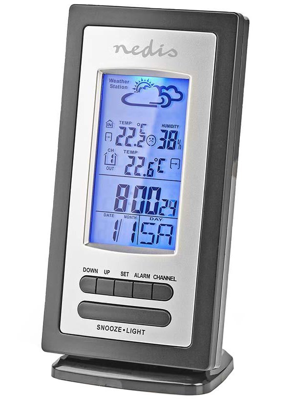Set složený ze základny a bezdrátového čidla nabízí digitální měření vnitřní i venkovní teploty a vlhkosti vzduchu. Samozřejmostí je předpověď počasí, zobrazení datumu a času, budík či indikátor komfortu, který ukazuje stav ovzduší v místnosti. Disponuje také tlačítkem pro modré podsvícení displeje a zapnutí funkce dřímání (Snooze), když zazvoní budík. Zajisté potěší paměť pro maximální a minimální naměřené hodnoty či možnost zvukového upozornění v případě dosažení zvolené venkovní teploty. Díky odnímatelnému stojánku ji lze jak postavit na rovnou plochu, tak zavěsit na stěnu. Venkovní čidlo je také vybaveno displejem, který zobrazuje aktuální teplotu a vybraný kanál.