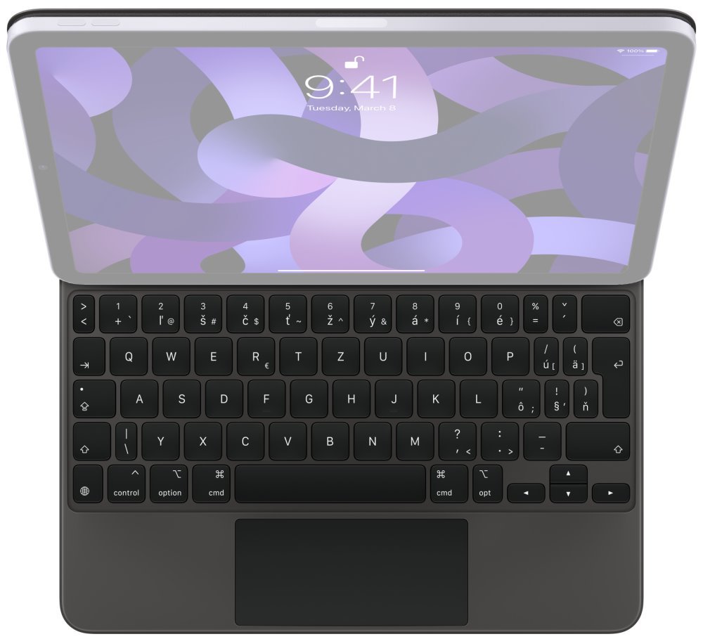 Magic Keyboard pro iPad Pro nebo iPad Air slouží jako klávesnice plné velikosti a elegantní pouzdro v jednom. Dá se nastavit do různých úhlů pro komfortní sledování obrazovky. Podsvícení kláves a přítomnost touchpadu přináší maximální efektivitu i pohodlí při práci. Na boční straně se nachází port USB typ C, skrze který lze iPad nabíjet.