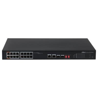 L2 PoE (802.3af/at/Hi-PoE) přepínač 16x 10/100 Base-TX RJ-45 s PoE, 2x 10/100/1000 Base-T RJ-45 uplink a 2x SFP 1000 Base-X slot (combo RJ-45/SFP).