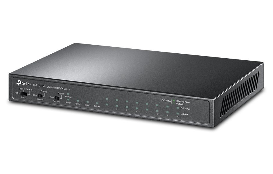 11portový stolní PoE/PoE+ switch umožňuje využít výkon 3x Gbit/s uplink portů a poskytuje kapacitu přepínání až 7,6 Gbit/s. Vyhovuje standardu 802.3af/at PoE+, který podporuje až 30 W na každém portu. Celkový rozpočet napájení 124 W PoE ze všech 8 portů poskytuje široké možnosti využití, například pro dohledové systémy pro kanceláře, studentské koleje a malé firmy. Je plně kompatibilní s IP kamerami, přístupovými body, IP telefony, počítači, tiskárnami a dalšími zařízeními. Technologie „Plug and Play“ umožňuje zapojení bez nutnosti nastavování. Vzdálenost přenosu napájení PoE dosahuje v rozšířeném režimu až 250 m, což je perfektní pro rozmístění IP kamer v rozsáhlých oblastech. Jedním kliknutím aktivujete režim izolace, jenž oddělí přenosy dat u portů 1–8 a zamezí tak sledování a narušení bezpečnosti. Switch díky tomu může izolovat zahlcení všesměrovým vysíláním, a zlepšit tak zabezpečení a datové přenosy v síti LAN.