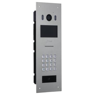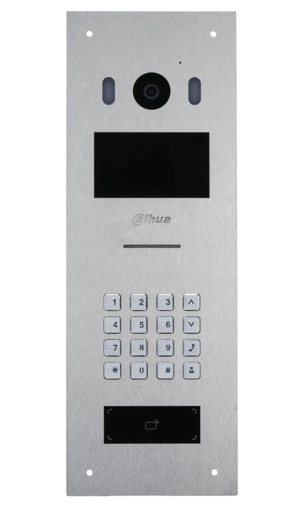 Dveřní stanice pro multiúčastnickou instalaci s 4,3" LCD panelem a kovovou klávesnicí s číslovkami v Braillově písmu. Barevná kamera s IR přísvitem, CMOS 2 Mpx 1/2,8", True WDR 120 dB, mikrofon a reproduktor, audio vstup, 1x alarm vstup, 1x alarm výstup, 1x Wiegand vstup/výstup (konfigurovatelné), 1x RS-485, napájecí výstup 12 V (200 mA), alarm proti neoprávněnému zásahu (Tamper Alarm). Odemknutí pomocí kódu, QR kódu, Mifare - RFID karty (13,56 MHz) nebo vzdáleně (aplikace).