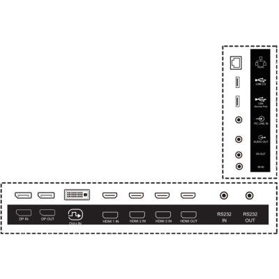Rozhraní: 3x HDMI vstup, 1x HDMI výstup, 1x DisplayPort vstup, 1x DisplayPort výstup, 1x DVI-I, 1x RJ-45, 2x USB 2.0, 1x audio vstup, 1x audio výstup, 1x RS-232 vstup, 1x RS-232 výstup, 1x IR vstup, 1x IR výstup