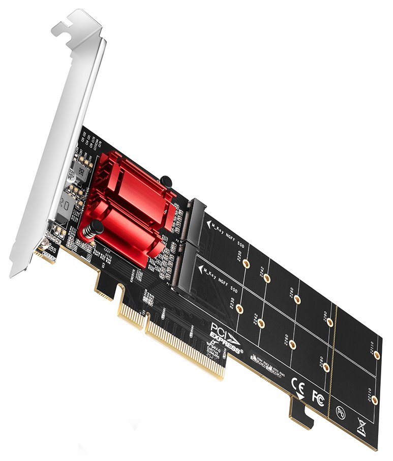 Řadič do slotu PCIe x8 pro připojení dvou M.2 disků do velikosti až 110 mm. Podporuje také softwarový RAID, například pro efektivní ochranu dat pomocí zrcadlení. Adaptér je napájen přímo z PCIe sběrnice, není nutné externí napájení.