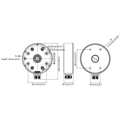 Instalační krabice/patice pro dome kamery Hikvision. Krabice je vhodná pro vnitřní i venkovní použití (nutné těsnění). Držák by měl být instalován na rovnou stěnu. Stěna musí unést více než 3krát větší hmotnost, než je celková hmotnost kamery a držáku.