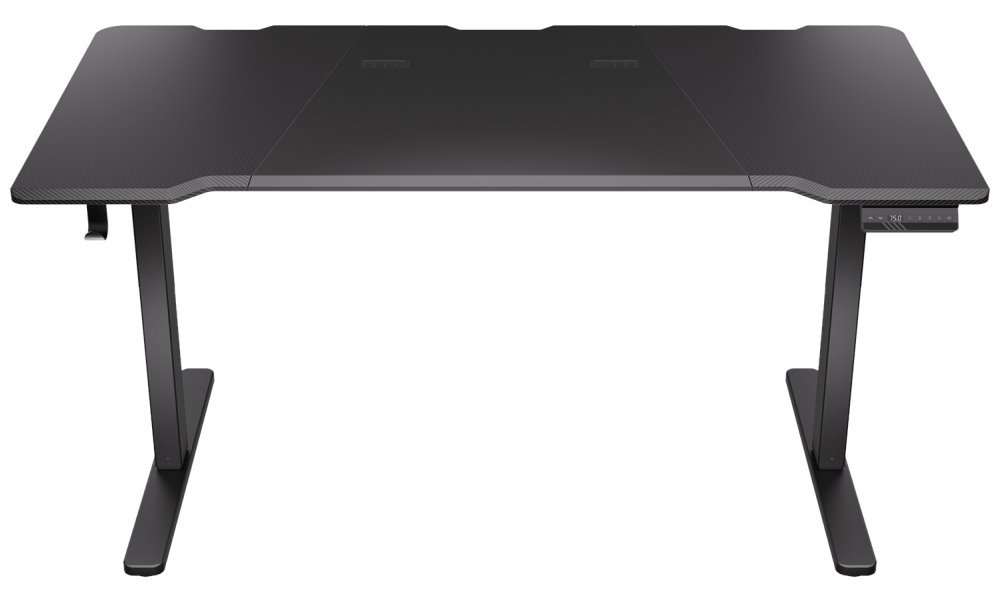 Herní stůl o délce 150 cm a šířce 78 cm nabízí dostatek prostoru pro myš, klávesnici a další příslušenství. Výšku lze plynule nastavit v rozsahu 73 až 120 cm pouhým stisknutím tlačítka na ovládacím panelu, který navíc umožňuje uložit až čtyři nastavení výšky. Na spodní straně desky je umístěn systém pro správu kabelů. Maximální stabilitu zajišťuje robustní ocelová konstrukce s nosností až 80 kg. Povrchová úprava desky stolu ve stylu uhlíkových vláken nejen dobře vypadá, ale je také odolná proti poškrábání. V neposlední řadě zajisté potěší kovová polička pro napájecí lištu na zadní straně a háček pro zavěšení sluchátek.