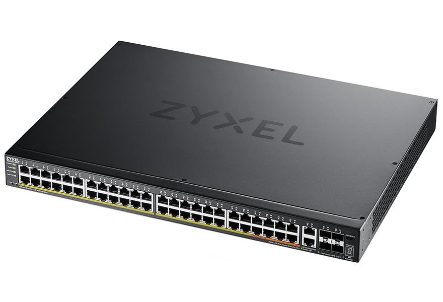 - Přepínač XGS2220-54FP podporuje standardy IEEE 802.3at/bt (PoE+/PoE++), díky čemuž dosahuje kapacity napájení až 60 W (resp. 30 W) na port.