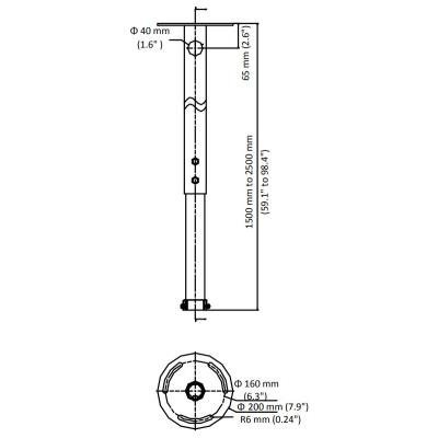 Teleskopický držák pro montáž PTZ kamer na strop, zatížitelnost 10 kg, nastavitelná délka v rozsahu 150 až 250 cm. Držák by měl být instalován na rovnou stěnu, která unese více než 3krát větší hmotnost, než je celková hmotnost kamery a držáku.