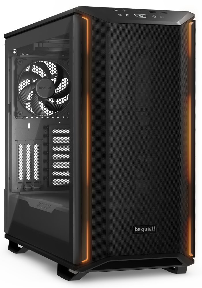 Kvalitní počítačová skříň s průhlednou bočnicí formátu Middle Tower nabízí dostatek prostoru pro uložení až pěti disků. Předinstalovány jsou tři 140 mm ventilátory, které lze optimalizovat jak pro tichý chod, tak pro výkon bez kompromisu pomocí tlačítek na horním panelu. Zde se také nachází dva porty USB 3.0, jeden port USB-C, sluchátkový výstup a audio vstup pro mikrofon. Herní design ještě doplňuje elegantní ARGB osvětlení. Ve skříni je dostatek prostoru pro chladič CPU do výšky až 185 mm a grafickou kartu o délce až 430 mm. Důmyslné řešení umožňuje pohodlné umístění až 360 mm dlouhého výměníku vodního chlazení na přední a horní straně. Potěší také přítomnost prachových filtrů. Skříň je dodávána bez zdroje.