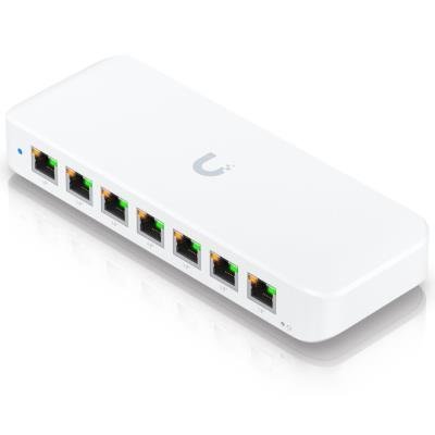 UniFi Switch Ultra je osazen sedmi výstupními GbE PoE+ RJ-45 porty a jedním vstupním GbE PoE++ RJ-45 portem. Jedná se o L2 switch s celkovou kapacitou 16 Gbps, neblokovanou propustností 8 Gbps a PoE budgetem až 202 W (v závislosti na typu napájení). Switch lze napájet buď přes DC konektor (54 V DC), nebo přes PoE++ (802.3at/bt) vstup na zadní straně. Díky přiloženému držáku jej lze snadno upevnit na stěnu.