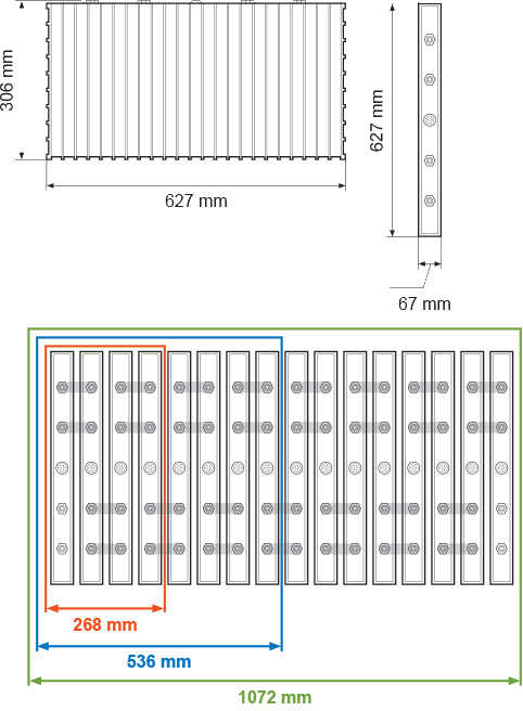 1 článek – Kapacita 2,1 kWh / Hloubka 67 mm / Hmotnost 21,6 kg