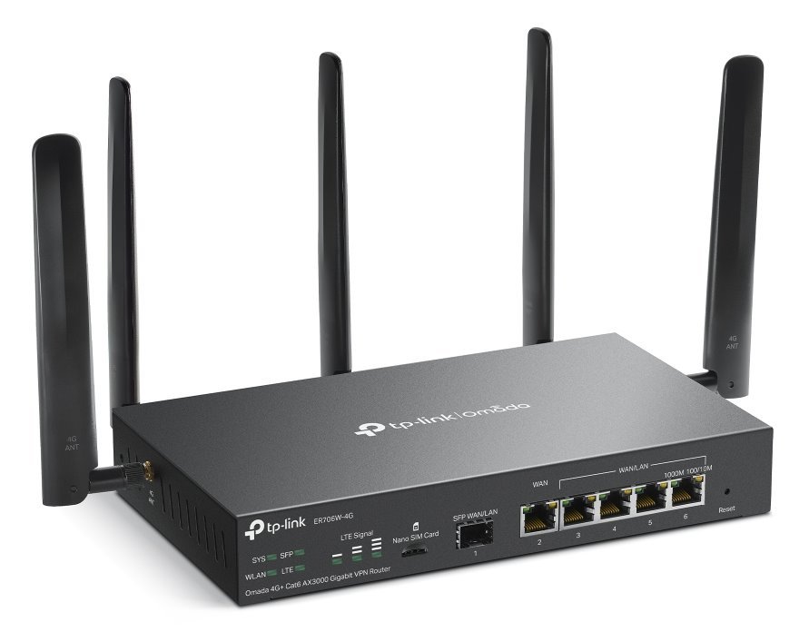 Router, bezdrátový, podnikový, 802.11ax, 4G+ LTE, 1× RJ-45 WAN, 4× RJ-45 WAN/LAN, 1× SFP, AX3000, Wi-Fi 6, Omada Mesh, VPN, černý