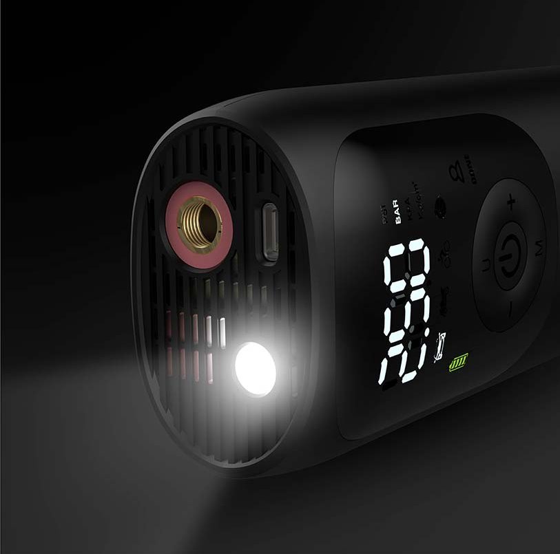 Výkonný multifunkční kompresor kapesních rozměrů s přehledným LED displejem, svítilnou a baterií o kapacitě 4000 mAh. Rychlost proudění vzduchu činí až 12 litrů za minutu a k dispozici jsou 4 režimy huštění: automobil, motocykl, jízdní kolo a míč. Automaticky se zastaví, když dosáhne nastaveného tlaku. Součástí balení je flexibilní vzduchová hadice, kulová jehla, pouzdro na přenášení, adaptér na ventil Presta a Dunlop, kroužková tryska a nabíjecí USB-C kabel. Plné dobití baterie trvá přibližně 3 hodiny a na jedno nabití dokáže dofouknout přibližně 8 pneumatik automobilu z 2,0 na 2,4 baru.
