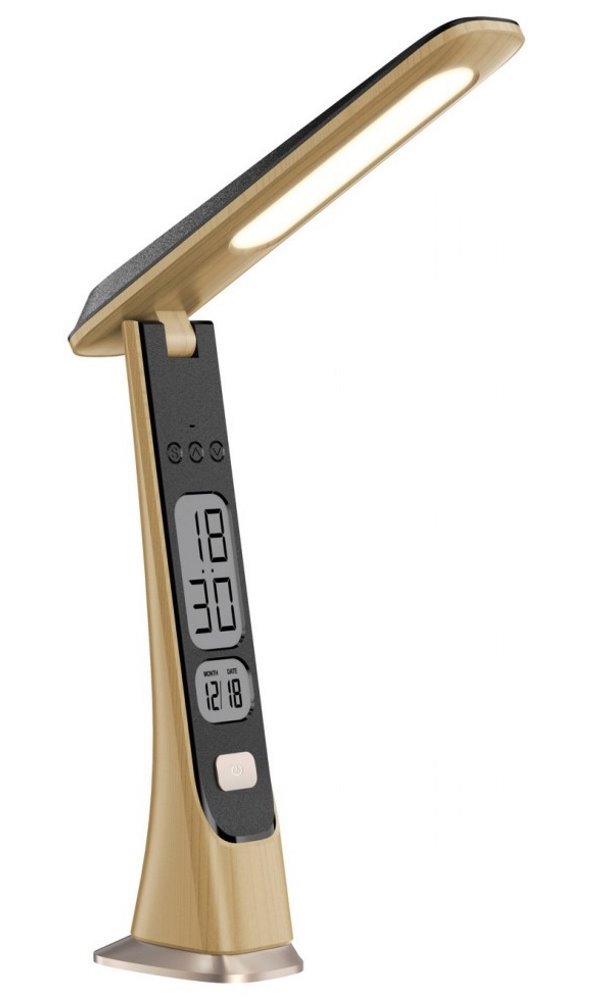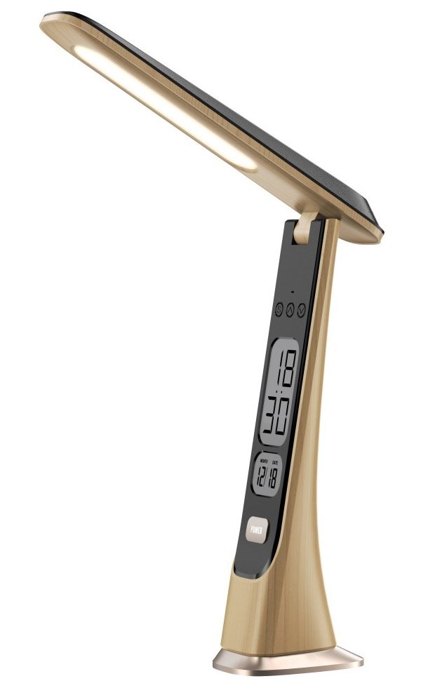 Stolní lampička, LED, 5W, teplá–studená bílá, 200lm, LED displej, hodiny, vestavěná baterie 1800mAh, imitace dřeva, černo-zlatá
