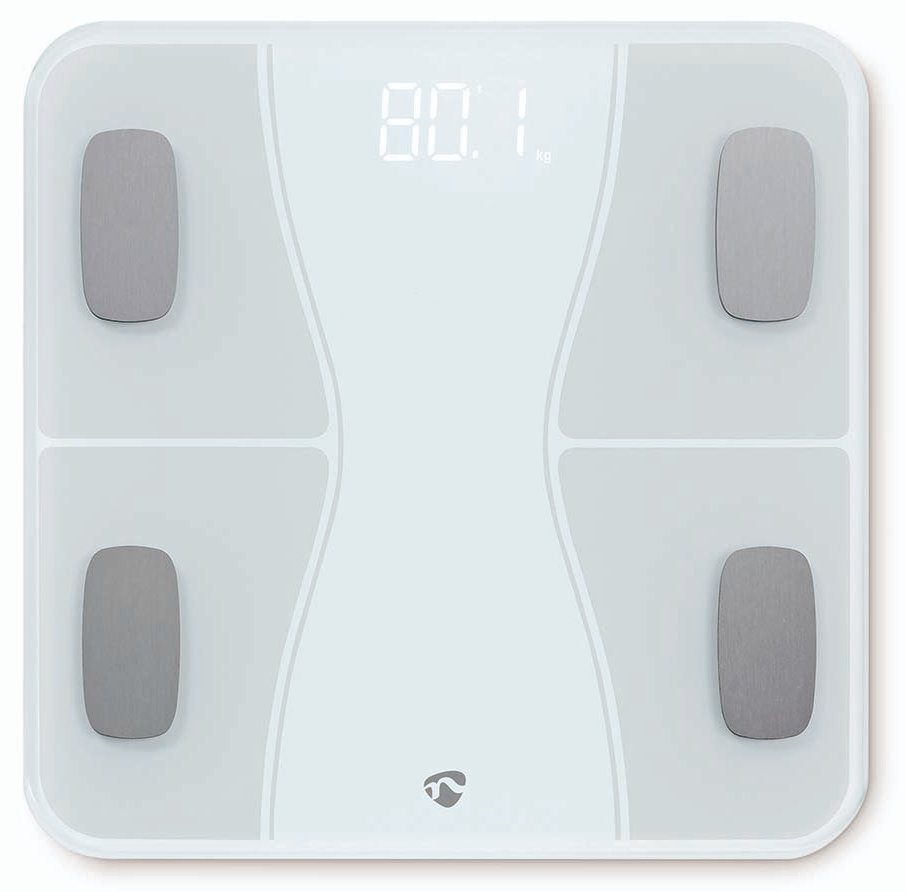 Digitální osobní váha, chytrá, nosnost 180kg, 16 tělesných parametrů, Bluetooth, Nedis SmartLife, plast, sklo, bílá