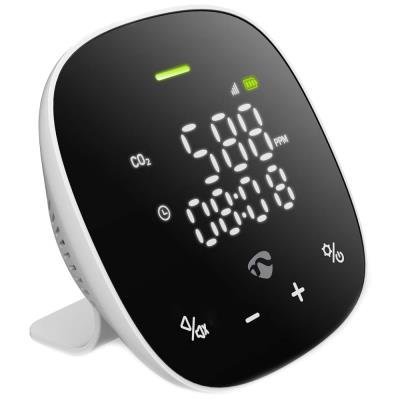 Detektor kvality ovzduší, pro chytrý dům, CO2, teplota, vlhkost, Wi-Fi, USB napájení, záložní baterie, černo-bílý