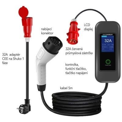 Nabíjecí stanice, pro elektromobily, 22kW, 3fázová, max. 32A, výstup IEC 62196 Typ 2, adaptér CEE na Schuko 1 fáze, 5m kabel, TUYA, černá