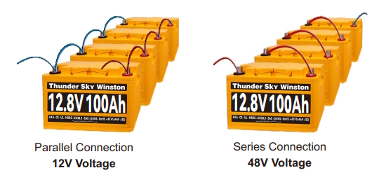 Až 4 baterie lze zapojit sériově nebo paralelně a vytvořit tak 12V nebo 48V akumulátor.