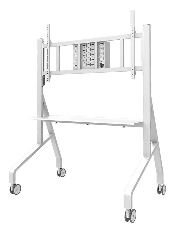 Mobilní podlahový stojan pro ploché obrazovky s úhlopříčkou od 65" do 110" a hmotností až 125 kg. Nabízí manuální nastavení výšky (129–139 cm) pro vytvoření optimálního pozorovacího úhlu. Pro snadný přesun je vybaven rukojeťmi a čtyřmi robustními kolečky o průměru 10 cm. Součástí stojanu je také police a zamykatelný perforovaný box s otvory pro průchod kabelů a montáž příslušenství. Obrazovku na vozíku lze zabezpečit pomocí visacího zámku (není součástí balení).