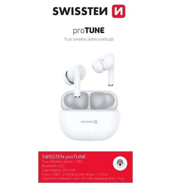Bezdrátová sluchátka SWISSTEN proTUNE v lehkém designu, která jsou určena pro komfortní poslech na cestách. Jejich váha dosahuje pouhých 2× 3,2 g a díky malým rozměrům se pohodlně nosí v uších po dlouhou dobu. Sluchátka SWISSTEN proTUNE podporují rovněž jednoduché ovládání hudby a umožní vám pozastavení přehrávání nebo změnu skladby. Bezdrátové připojení zajišťuje technologie Bluetooth 5.0, díky čemuž je spárování se smartphonem, tabletem nebo notebookem rychlé a stabilní. Součástí sluchátek je také integrovaný mikrofon, který vám umožní snadné a efektivní vyřizování mobilních hovorů. Nechybí ani praktické pouzdro, které kromě nabíjení plné také ochranou funkci při přenášení v kapse. Headset do uší SWISSTEN proTUNE zvládne až 3 hodiny kontinuální poslechu hudby, podcastů, audio knih, rozhlasového vysílání a dalšího audio obsahu.