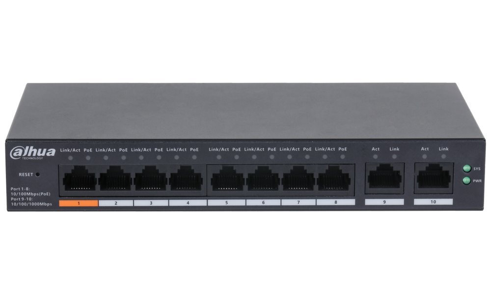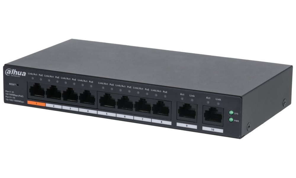 Spravovatelný 10portový switch disponující osmi RJ-45 100 Mb/s porty s podporou PoE a dvěma gigabitovými RJ-45 porty pro uplink. Podporuje PoE standardy 802.3af/at a Hi-PoE, přičemž první port podporuje napájení až 60 W/port a zbylých sedm portů podporuje až 30 W/port. Celkový PoE budget je až 60 W.