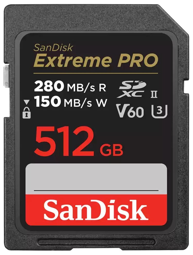 Paměťová karta formátu SDXC nabízí kapacitu 512 GB. Rychlost čtení je až 280 MB/s a rychlost zápisu až 150 MB/s. Třída Video Speed Class 60 zaručuje minimální trvalou rychlost zápisu 60 MB/s, což stačí na záznam videa ve filmové kvalitě s rozlišením 6K ve standardním režimu záznamu.