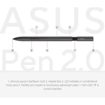 Aktivní dotykové pero ASUS Pen 2.0 je ideální pro psaní poznámek či kreslení na dotykovém displeji. Pracuje s technologií MPP 2.0, která nabízí velmi krátkou latenci a rychlou odezvu. Citlivost až 4096 úrovní tlaku a síla hrotu pera 5 až 350 g vám umožní zaznamenat nejjemnější linie i široké tahy štětcem. Stylus podporuje párování přes Bluetooth pomocí jednoho kliknutí a nabízí několik přednastavených zkratek pro snadnější ovládání. Funkční tlačítka zahrnují jedno horní tlačítko pro klávesové zkratky a dvě boční tlačítka určená pro klikání myší a mazání. Nabíjení je řešeno pomocí USB-C konektoru pro rychlé nabití za 30 minut, které zajistí více než 140 hodin provozu.