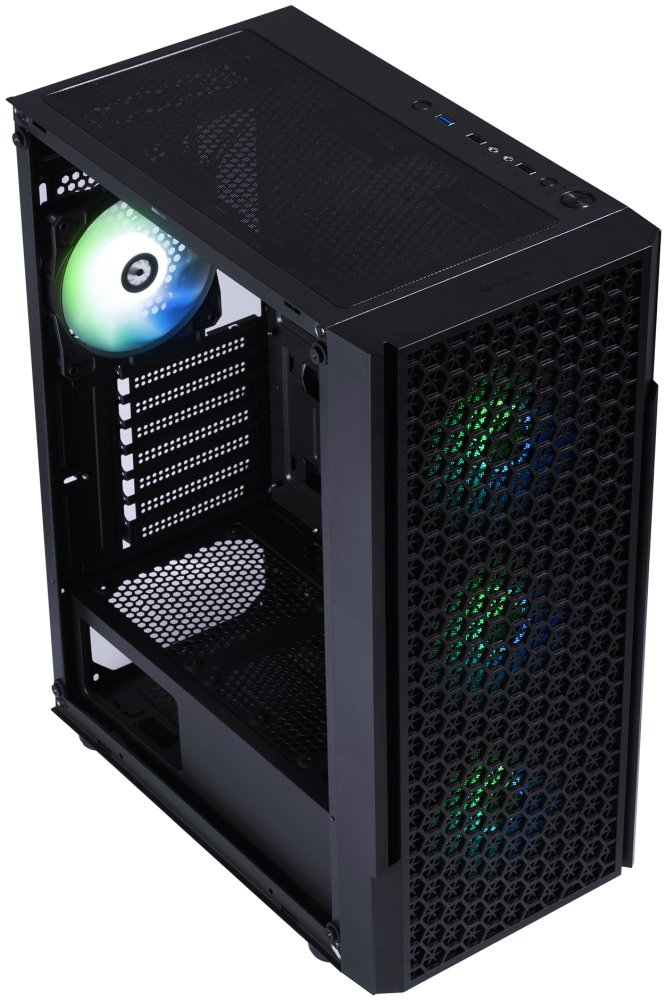 Herní počítačová skříň nabízí stylovou prosklenou bočnici a poloprůhledný přední panel. Skříň je osazena čtyřmi ventilátory o velikosti 120 mm s FRGB podsvícením. Potěší také možnost rozšíření o další 2 ventilátory. Důmyslné řešení umožňuje pohodlné umístění až 360 mm dlouhého výměníku vodního chlazení na přední straně. Ve skříni je dostatek prostoru pro chladič CPU do výšky až 165 mm a grafickou kartu o délce až 330 mm. Na horním panelu se nachází dva USB 2.0 porty, jeden port USB 3.0, sluchátkový výstup a vstup pro mikrofon. Samozřejmostí jsou také prachové filtry. Skříň je dodávána bez zdroje.