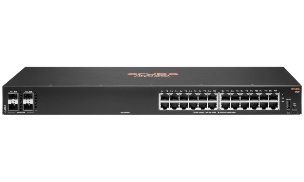 HPE Aruba Networking CX 6100 je moderní řada switchů základní úrovně, která je ideální pro pobočky, malé a střední podniky. Tato řada, navržená pro spolehlivý, jednoduchý a bezpečný přístup, poskytuje pohodlné řešení pro podnikové sítě podporující IoT, mobilní a cloudové aplikace.