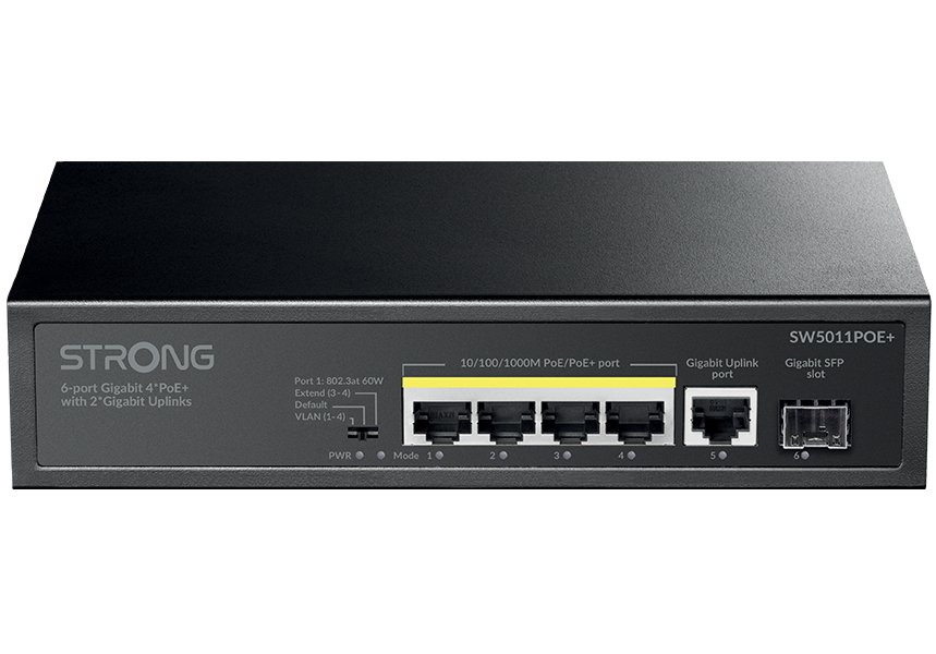 Strong SW5011POE+ je profesionální 6portový gigabitový switch navržený pro vysoký výkon a spolehlivé síťové připojení. Nabízí 4 PoE+ gigabitové Ethernet porty podporující standardy IEEE 802.3af/at a 2 gigabitové uplink porty (1× RJ45, 1× SFP) pro zajištění plynulého přenosu dat a inteligentního napájení připojených zařízení.