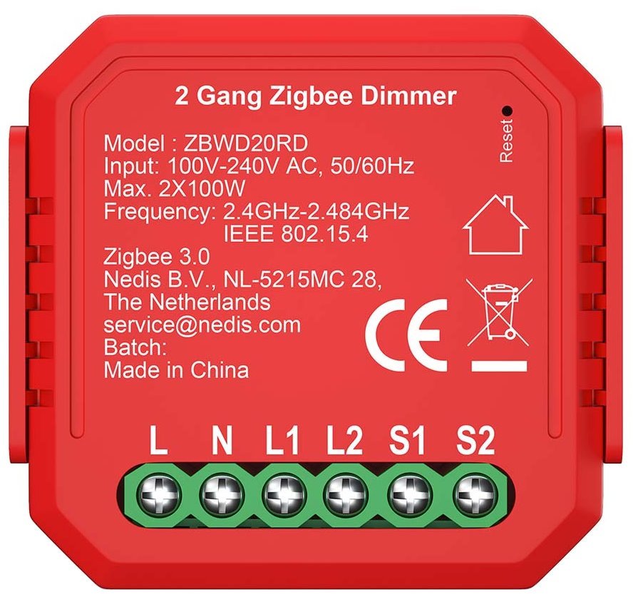 Spínač osvětlení, duální, Smart, 2× 100W, připojení terminálu, Zigbee 3.0, Android, iOS, Nedis SmartLife, červený