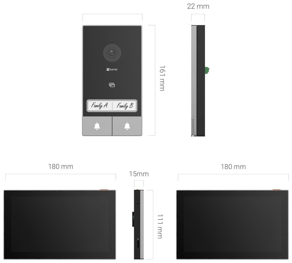 Dveřní stanice je vybavena dvěma zvonky a kamerou s rozlišením 2048 × 1296 px. Úhel záběru kamery je 162° diagonálně. Pro přenos obrazu je používán kodek H.265. Samozřejmostí je integrovaný mikrofon, reproduktor a čtečka přístupových čipů RFID. Připojení zvonku je realizováno 2drátově. Dotykový 7" monitor lze připojit pomocí Wi-Fi a disponuje microSD slotem. Vzdálené ovládání přes aplikaci, povrchová montáž, odolnost vůči nepříznivým vlivům dle certifikace IP65. Z chytrých funkcí je k dispozici například detekce lidské postavy, možnost vygenerování dočasného návštěvnického kódu či volitelná funkce změny hlasu pro zachování soukromí při komunikaci.