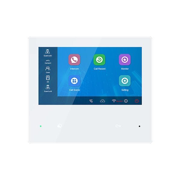 Komfortní barevný TFT 7" bytový monitor s dotykovou obrazovkou, rozlišení 1024 × 600, interkom, paměť (slot pro microSD kartu), podpora ONVIF kamery, napájení DC 20–28 V (ze sběrnice).