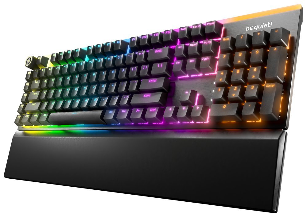 Klávesnice s tichými taktilními mechanickými spínači be quiet! s továrním mazáním a podporou výměny za provozu. Nabízí třívrstvé zvukové tlumení, hliníkové tělo, dvojité PBT klávesy s prosvítajícími popisy a podsvícení každé klávesy pomocí ARGB difuzorů.