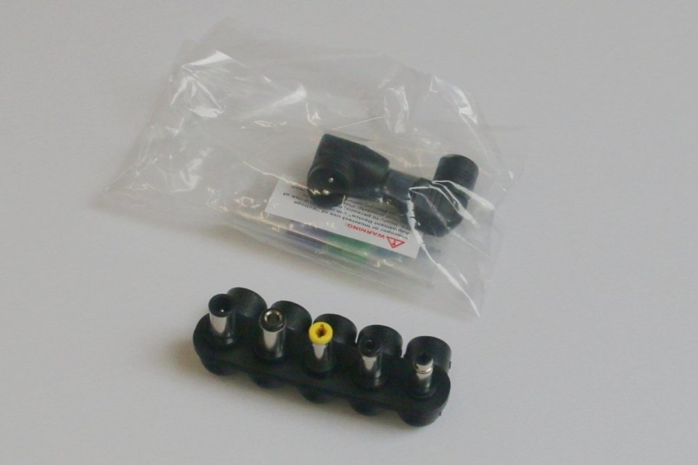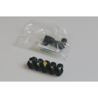 Balení obsahuje napájecí adaptér s připojeným kabelem zakončeným autozástrčkou, sadu 7 výměnných koncovek pro různé typy notebooků a 5 nastavovacích odporů pro volbu správného výstupního napětí.